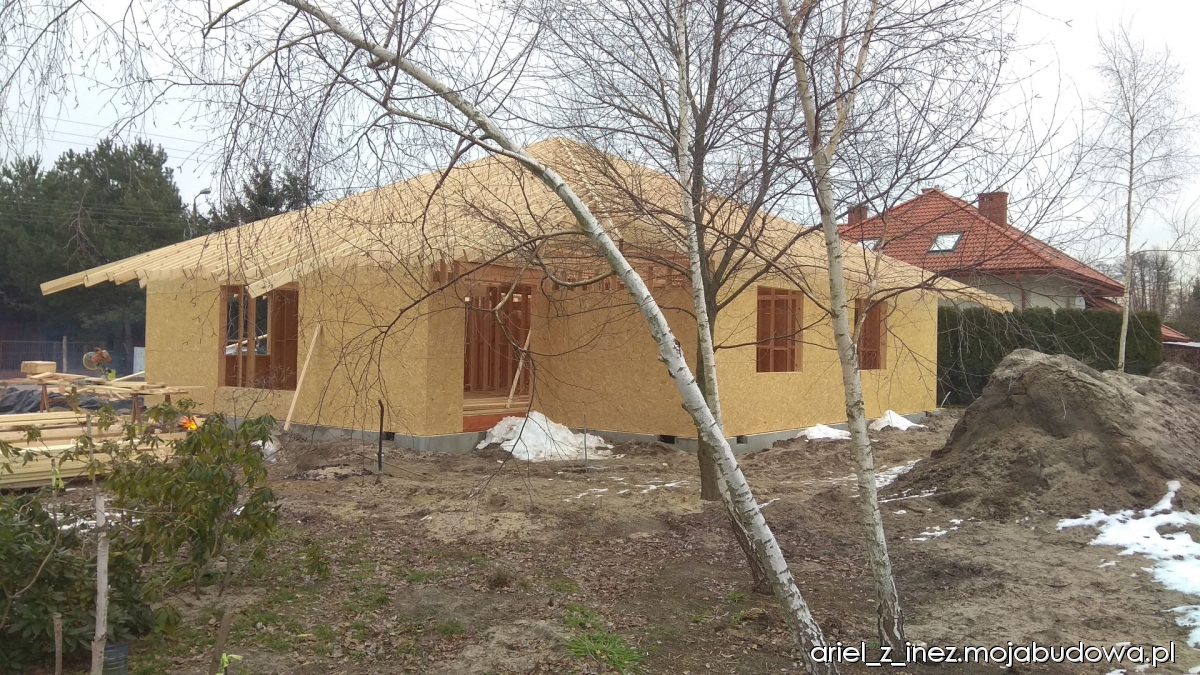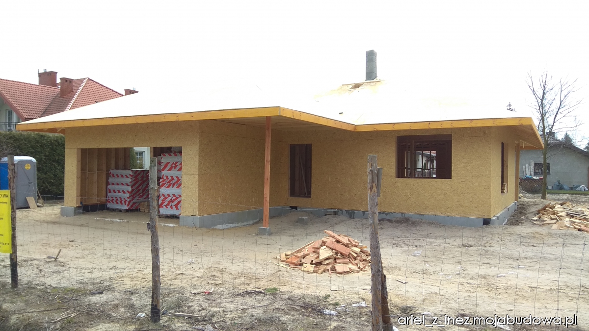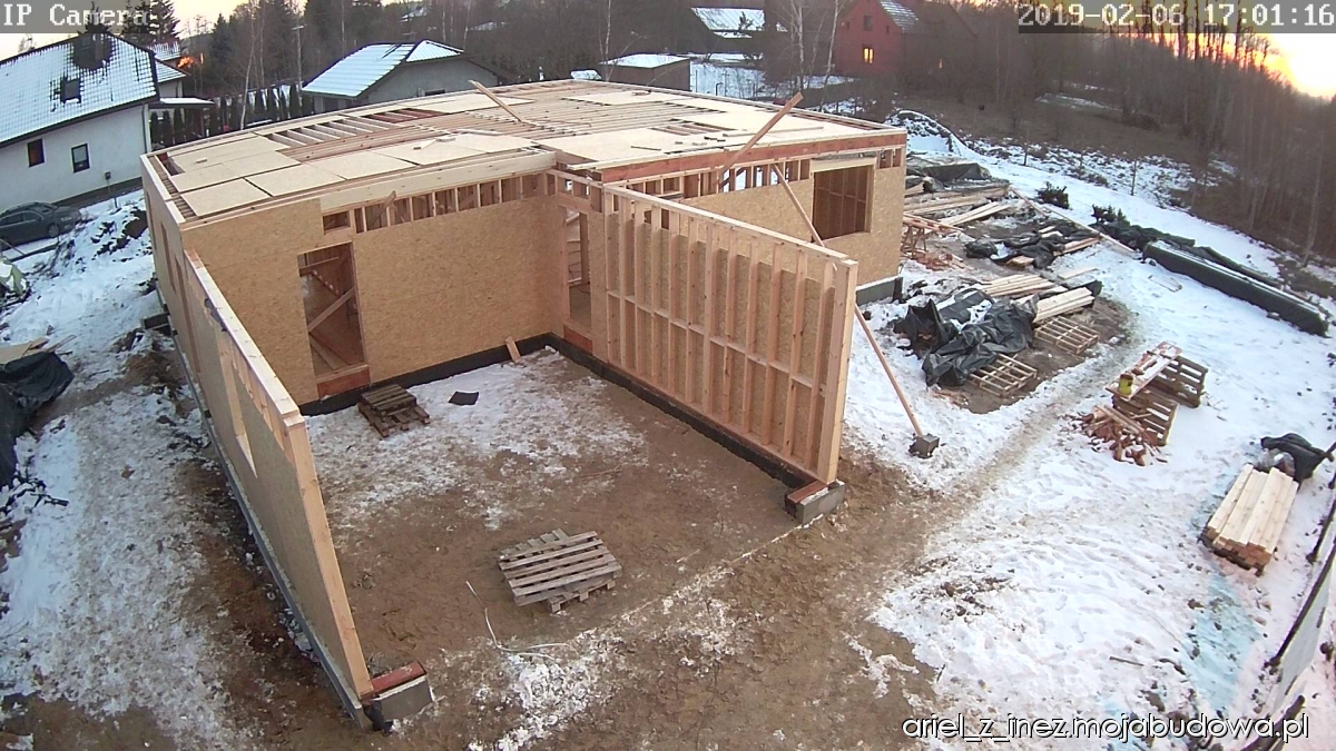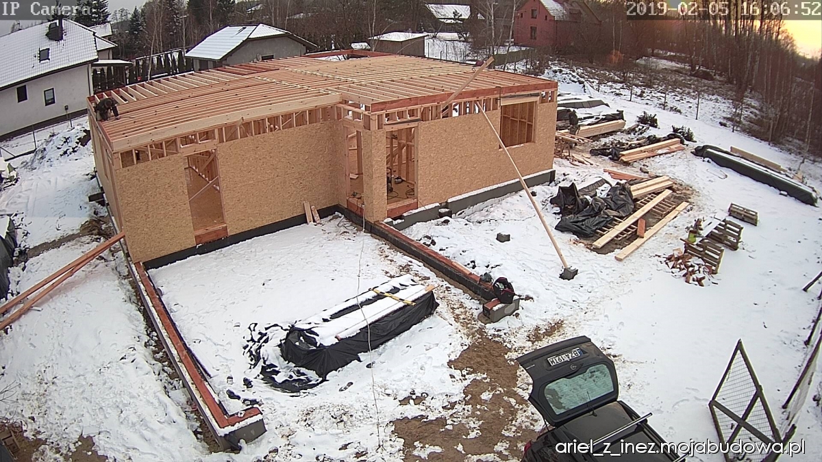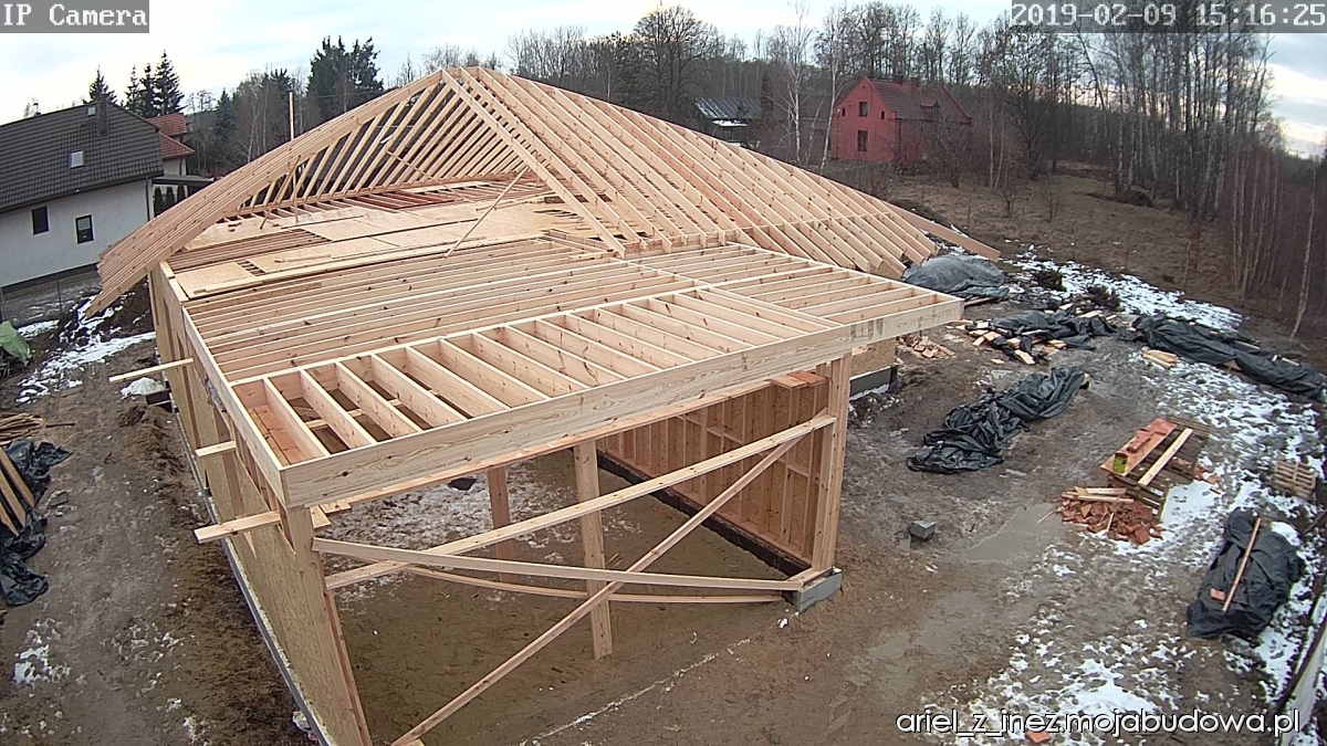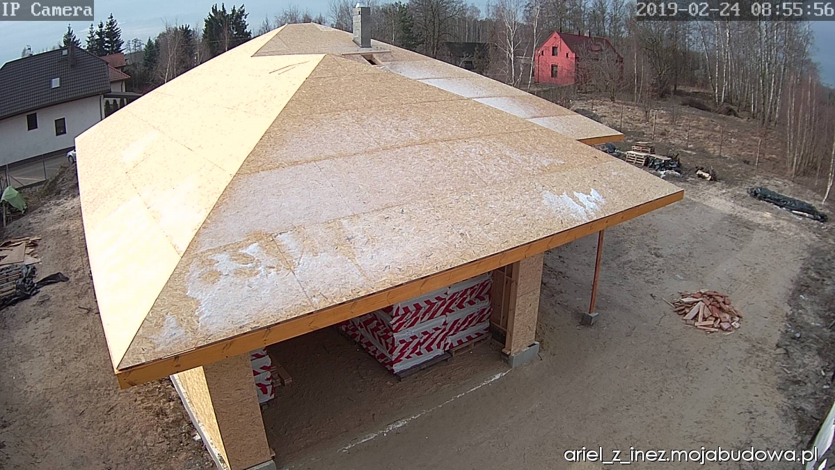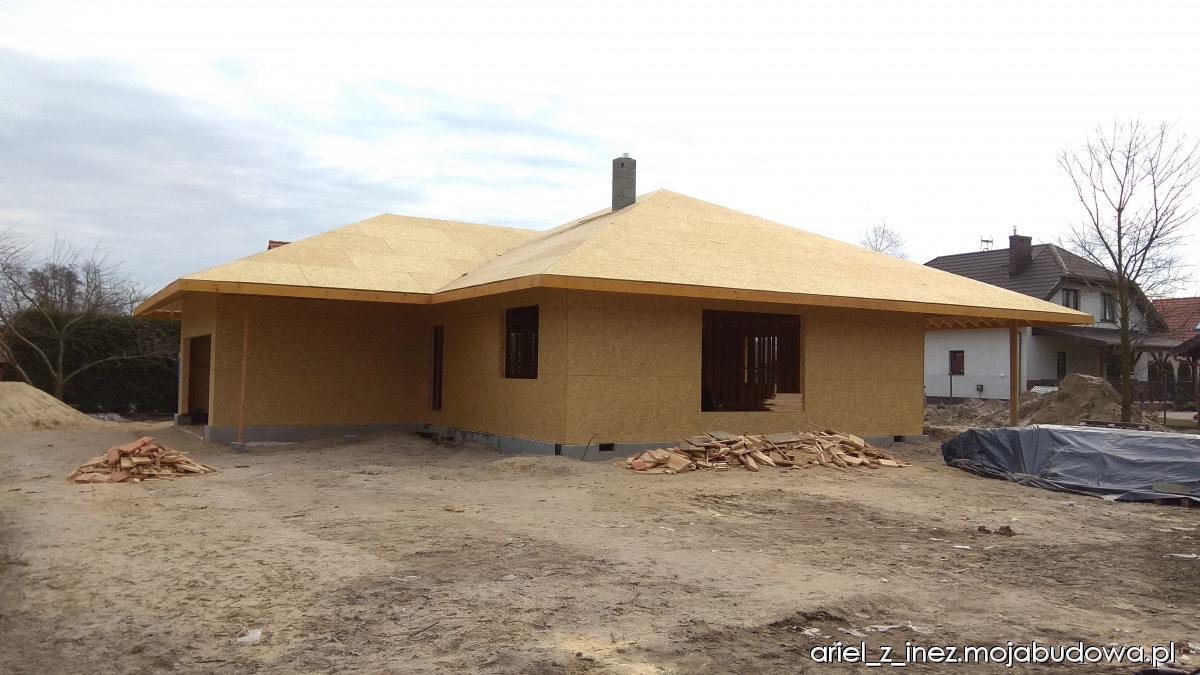 W 5 tygodni dojechaliśmy do SSO, a praktycznie wg dni pracujących w 4. Firma się spręża bo w poniedziałek zaczynają dekarze. Oczywiście zostało jeszcze trochę do wykończenia w szkielecie, ale dach jest gotowy do pokrycia. W miedzy czasie pojawił się komin. Jak zostaną wstawione okna to będzie można ustawić kozę i trochę podgrzać wewnątrz żeby instalatorzy mieli wygodniej pracować. Chyba że wcześniej przyjdzie prawdziwa wiosna i będzie ciepło.