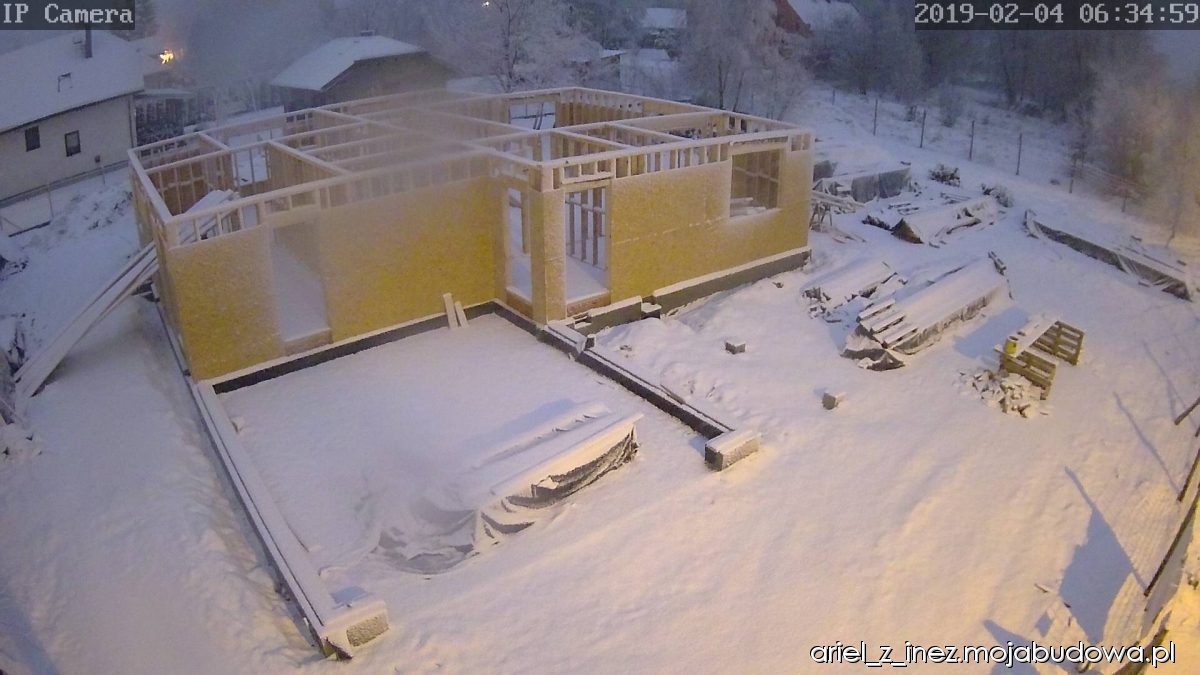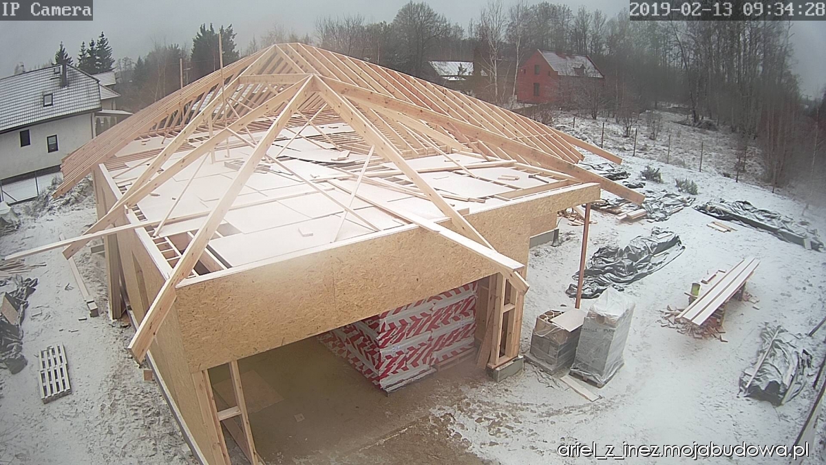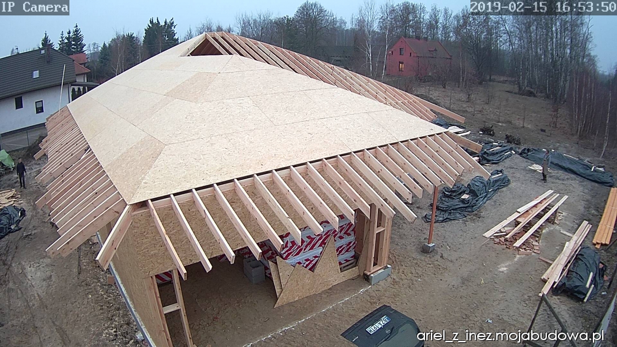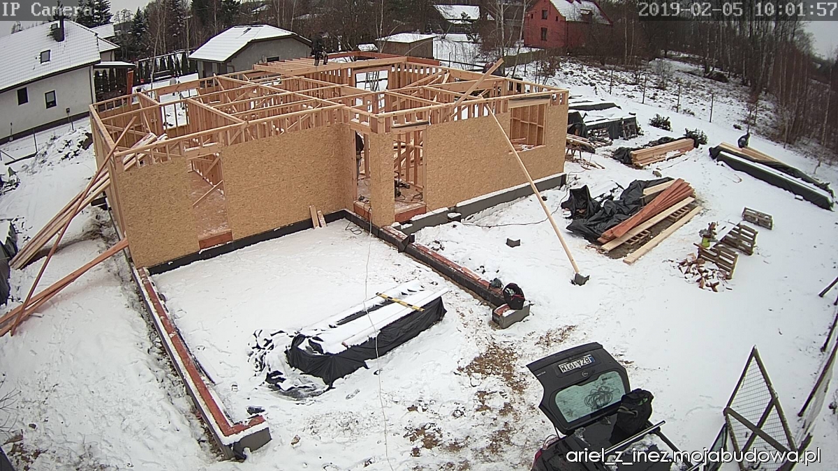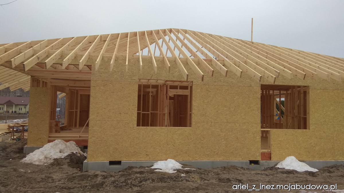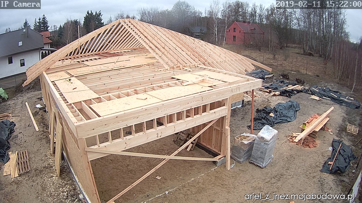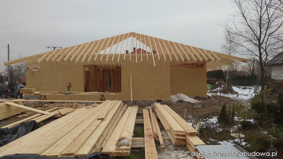 W 5 tygodni dojechaliśmy do SSO, a praktycznie wg dni pracujących w 4. Firma się spręża bo w poniedziałek zaczynają dekarze. Oczywiście zostało jeszcze trochę do wykończenia w szkielecie, ale dach jest gotowy do pokrycia. W miedzy czasie pojawił się komin. Jak zostaną wstawione okna to będzie można ustawić kozę i trochę podgrzać wewnątrz żeby instalatorzy mieli wygodniej pracować. Chyba że wcześniej przyjdzie prawdziwa wiosna i będzie ciepło.