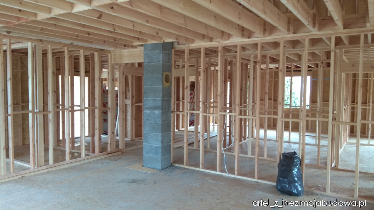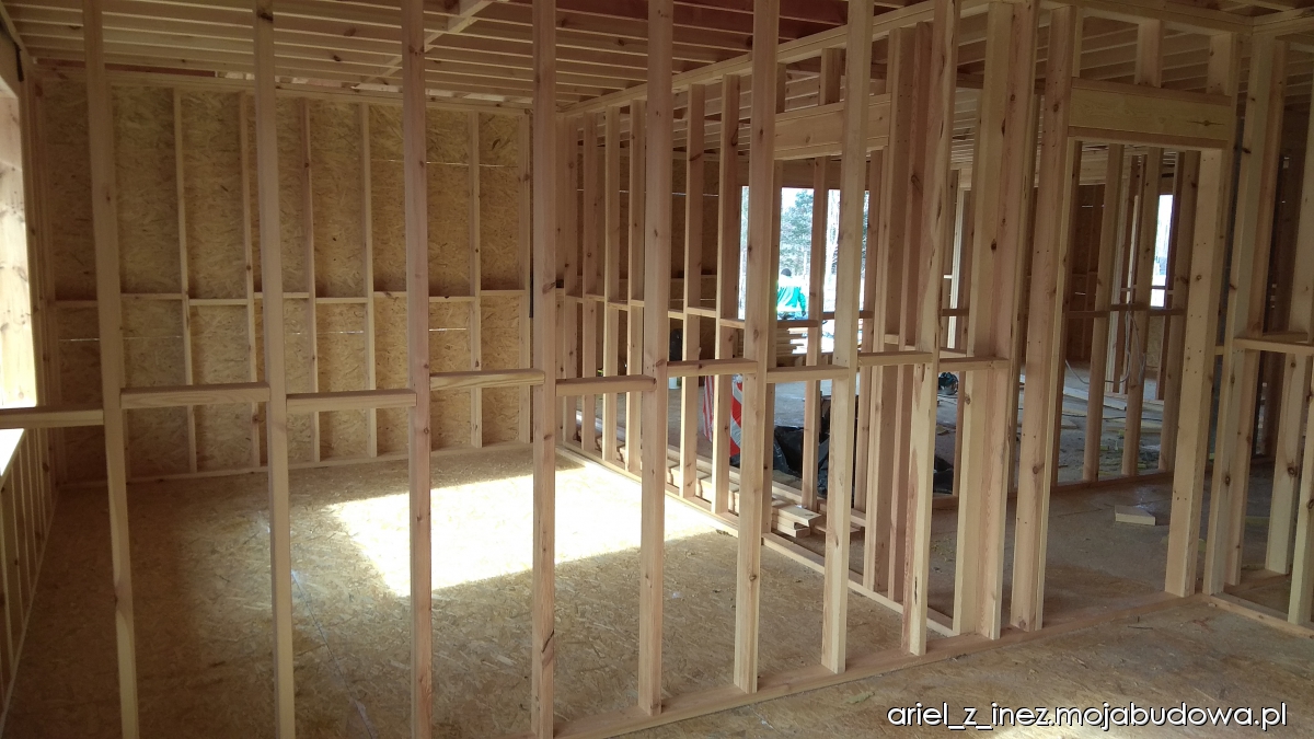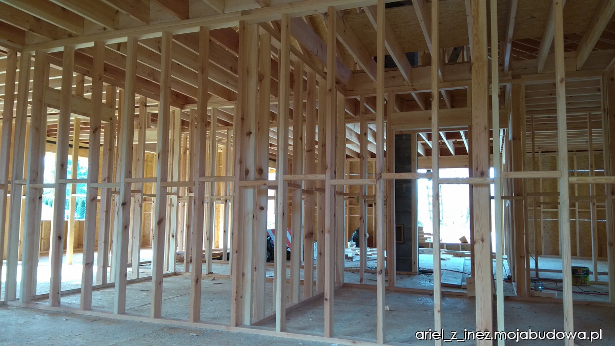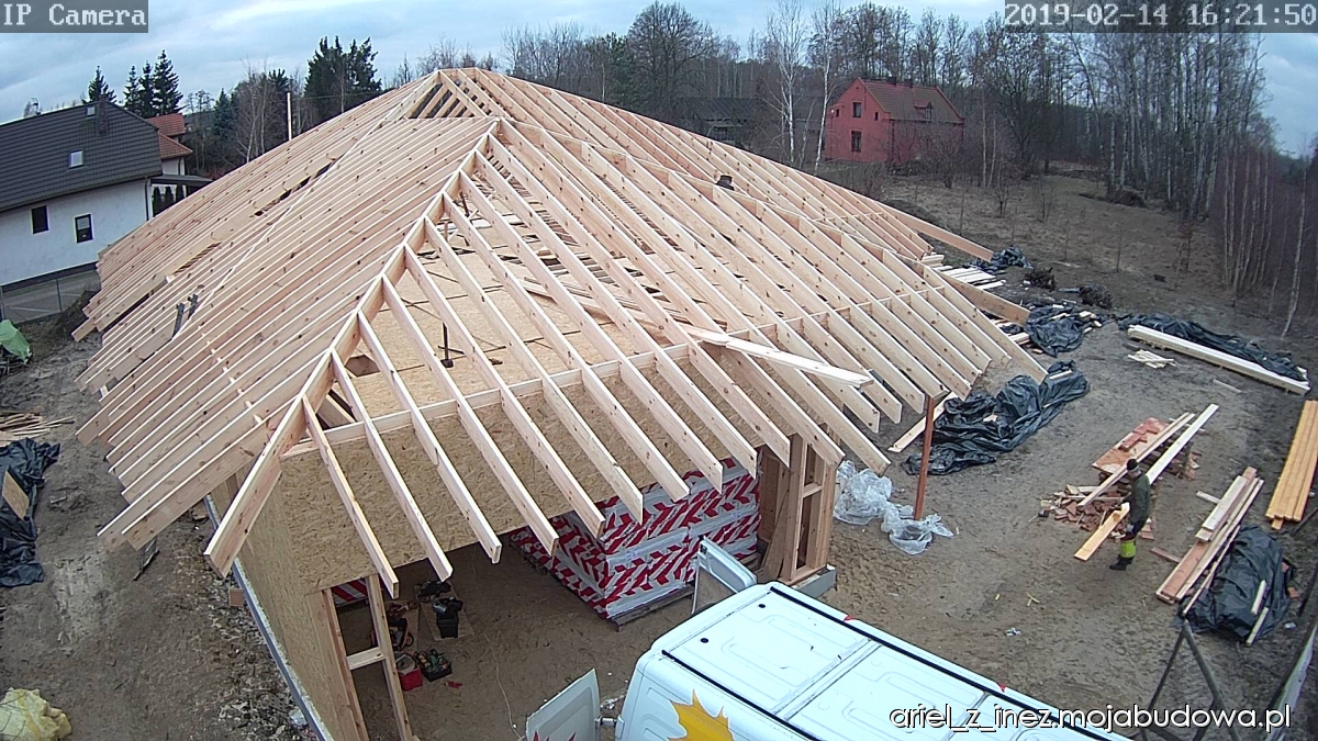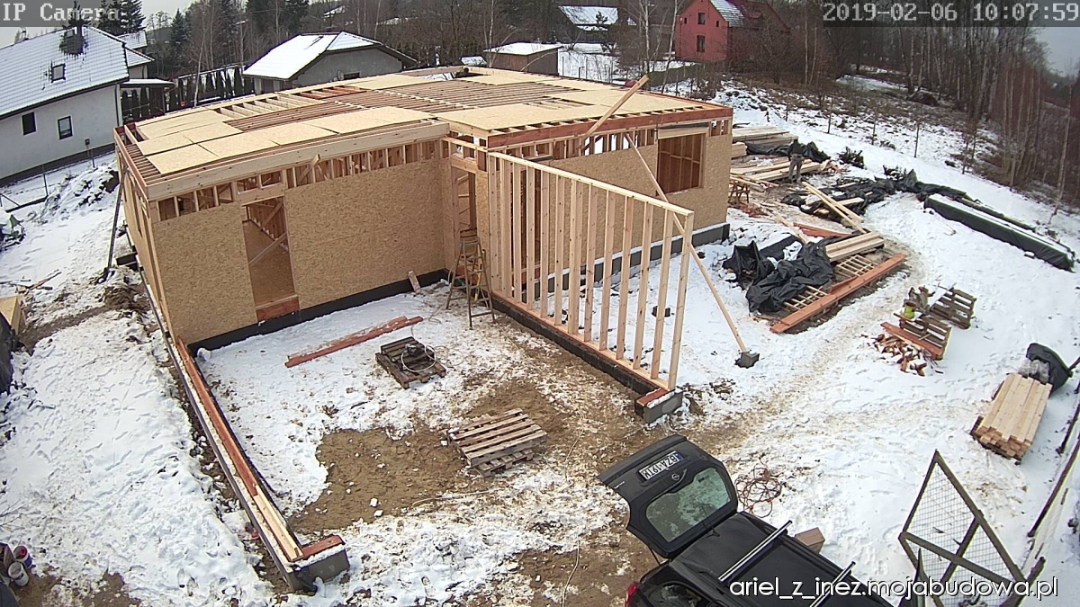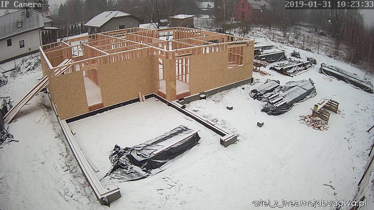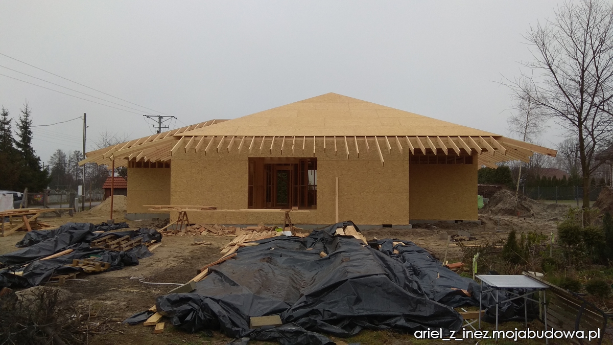 W 5 tygodni dojechaliśmy do SSO, a praktycznie wg dni pracujących w 4. Firma się spręża bo w poniedziałek zaczynają dekarze. Oczywiście zostało jeszcze trochę do wykończenia w szkielecie, ale dach jest gotowy do pokrycia. W miedzy czasie pojawił się komin. Jak zostaną wstawione okna to będzie można ustawić kozę i trochę podgrzać wewnątrz żeby instalatorzy mieli wygodniej pracować. Chyba że wcześniej przyjdzie prawdziwa wiosna i będzie ciepło.