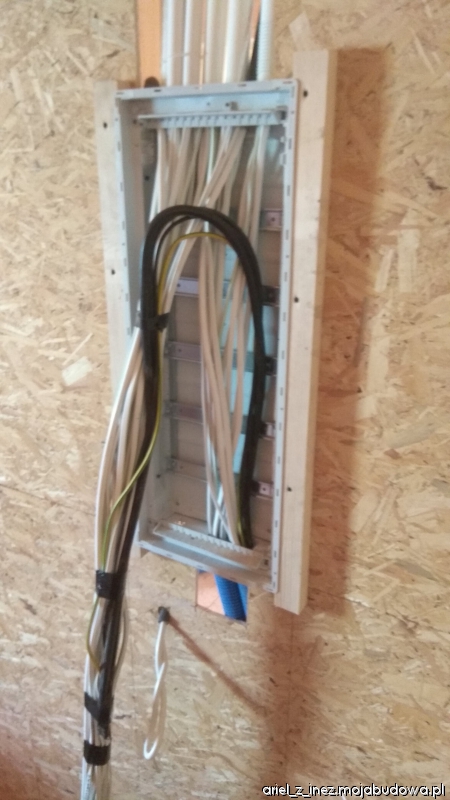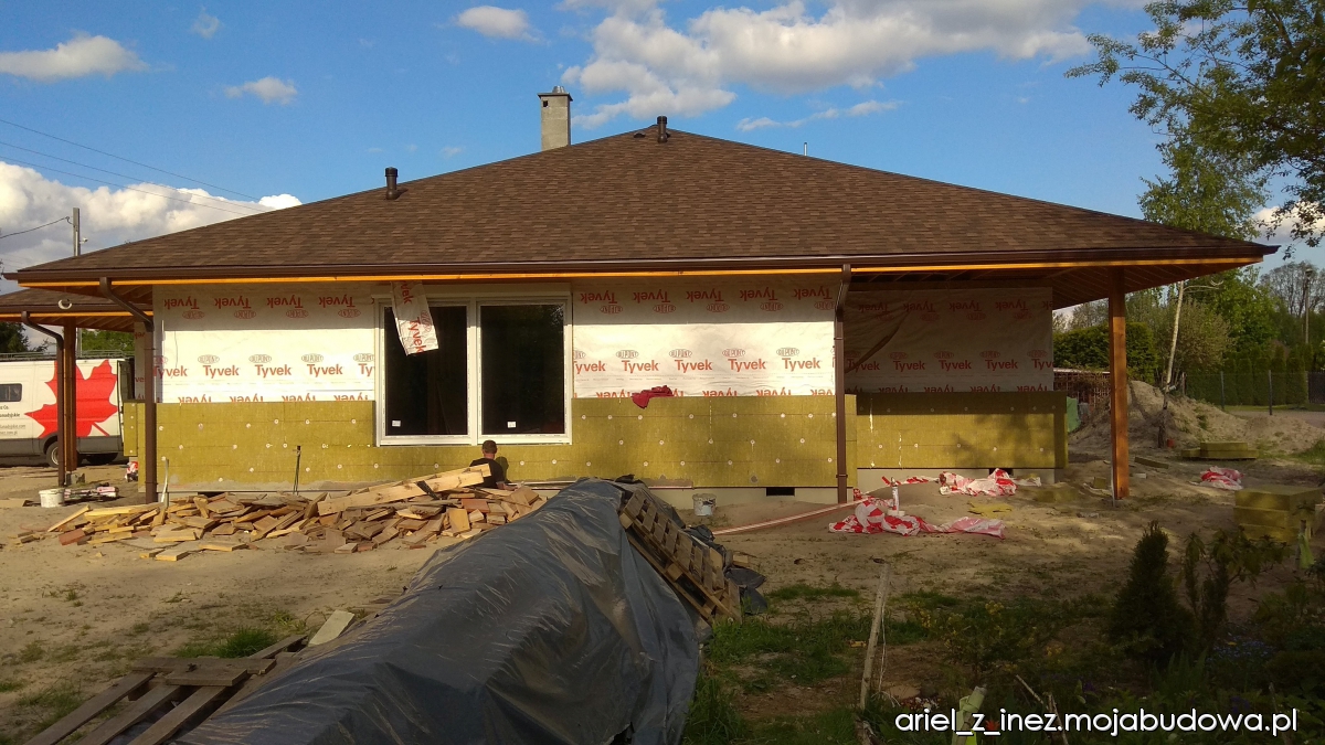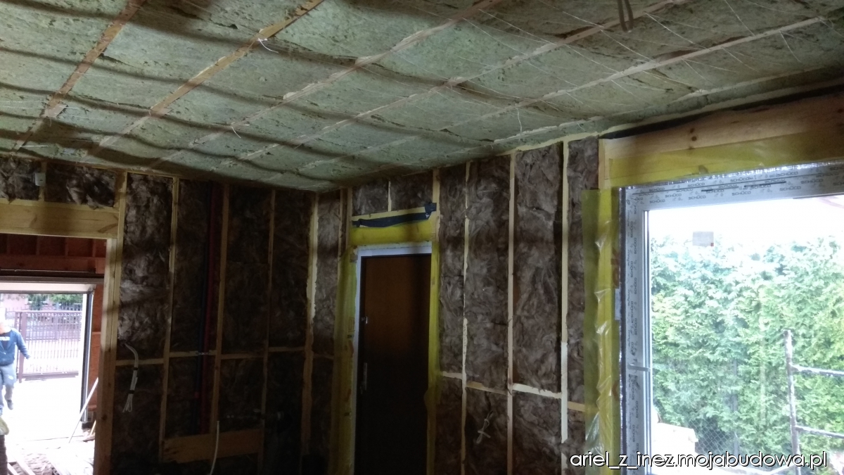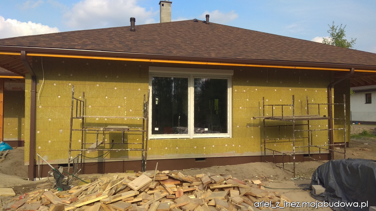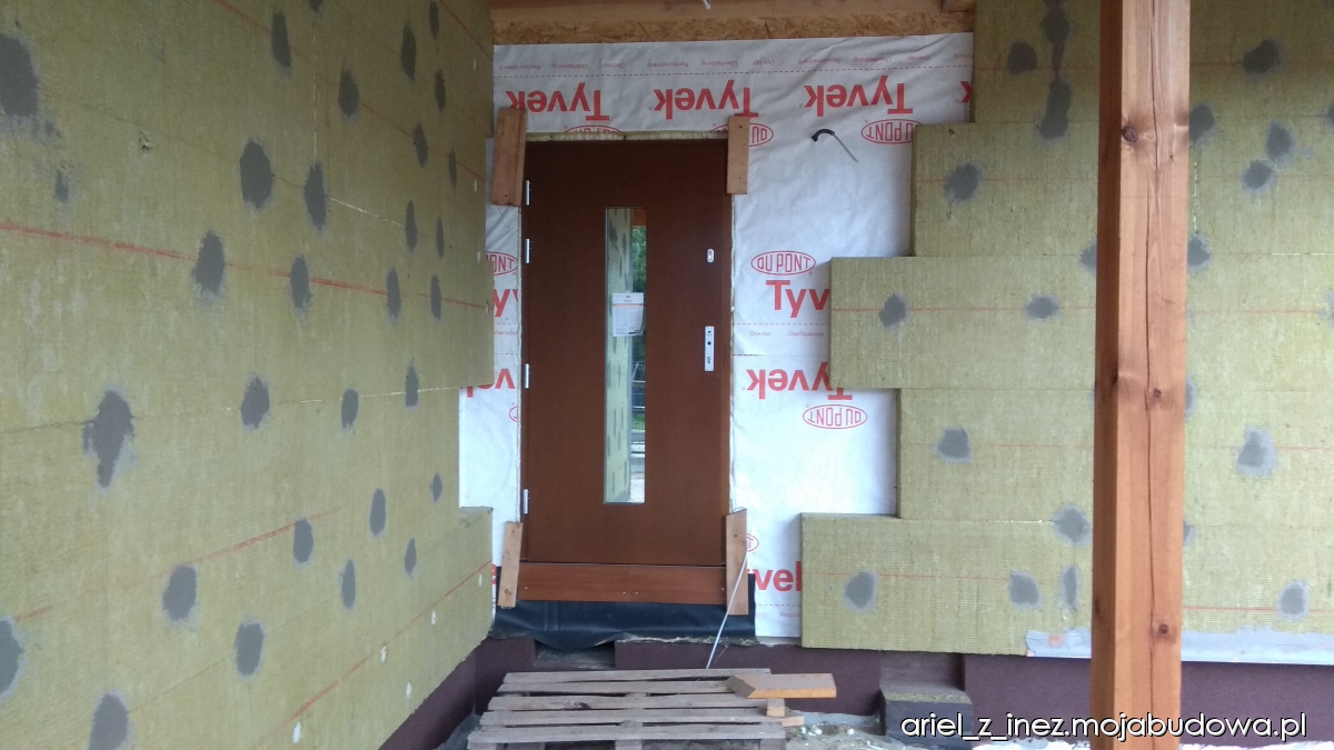 Za to od 6 maja praca wre jak w ulu. W ciągu dwóch tygodni zostały przykręcone płyty wełny skalnej na zewnątrz, wyłożone ściany wewnątrz wełną szklaną, przygotowany ruszt pod płyty GK oraz paroizolacja ścian wewnętrznych. W sumie w ścianach mamy położone 30 cm wełny. Na zewnątrz trwają prace przygotowawcze pod zaciąganie klejem, są przyklejane kątowniki na wszystkich narożnikach, obrabiane glify, montowane parapety. W międzyczasie zostały wstawione drzwi zewnętrzne, są bardzo ciepłe - mają aż 9 cm grubości. Jedna ze ścian została zaciągnięta klejem. Pogoda niestety w ostatnim okresie na sprzyja pracom na zewnątrz. Ciągle padało, a i temperatura nie należała do wysokich w tym okresie. Mamy nadzieję, że tempo prac zostanie utrzymane i wielkimi susami podążymy do upragnionego końca budowy.